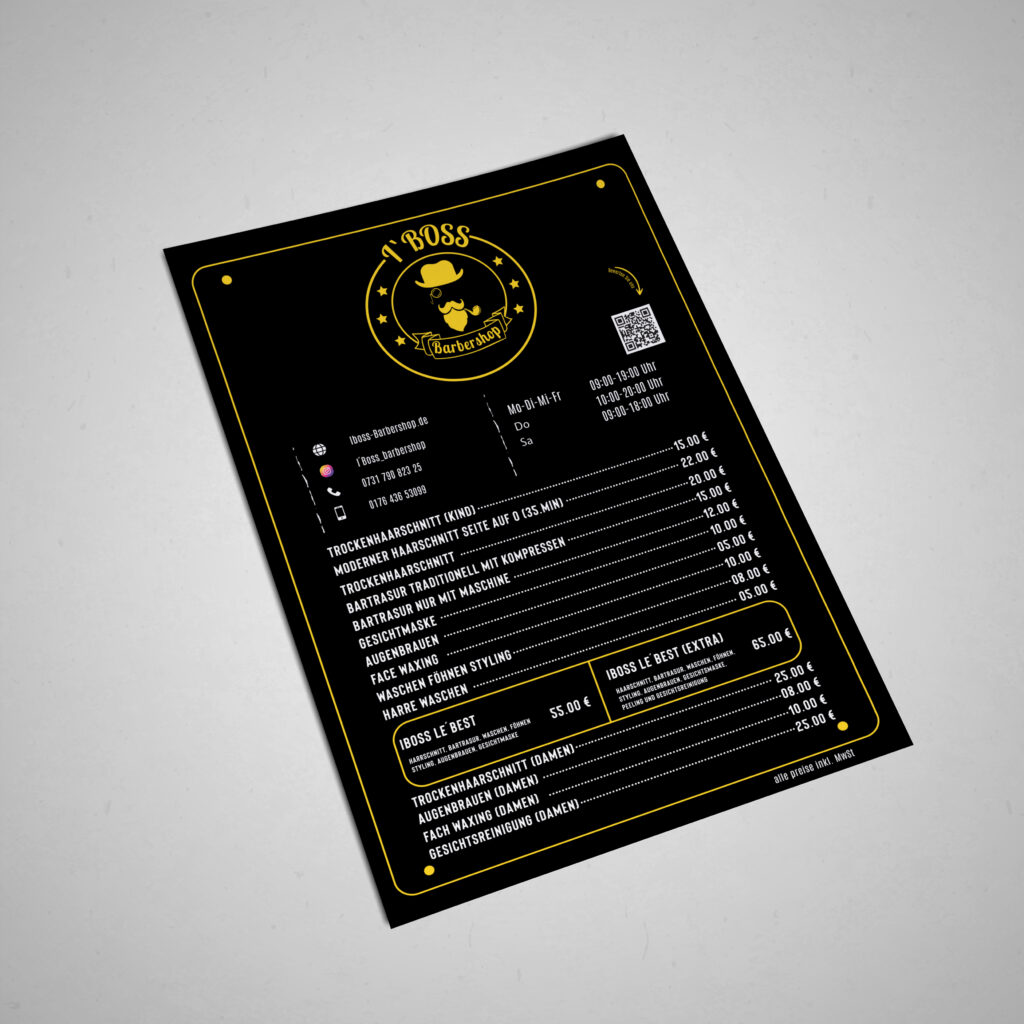 Diese Preisliste wurde für einen Barbershop gestaltet. Sie zeigt die angebotenen Dienstleistungen sowie die preise in einem klaren, modernen und professionellen Layout.